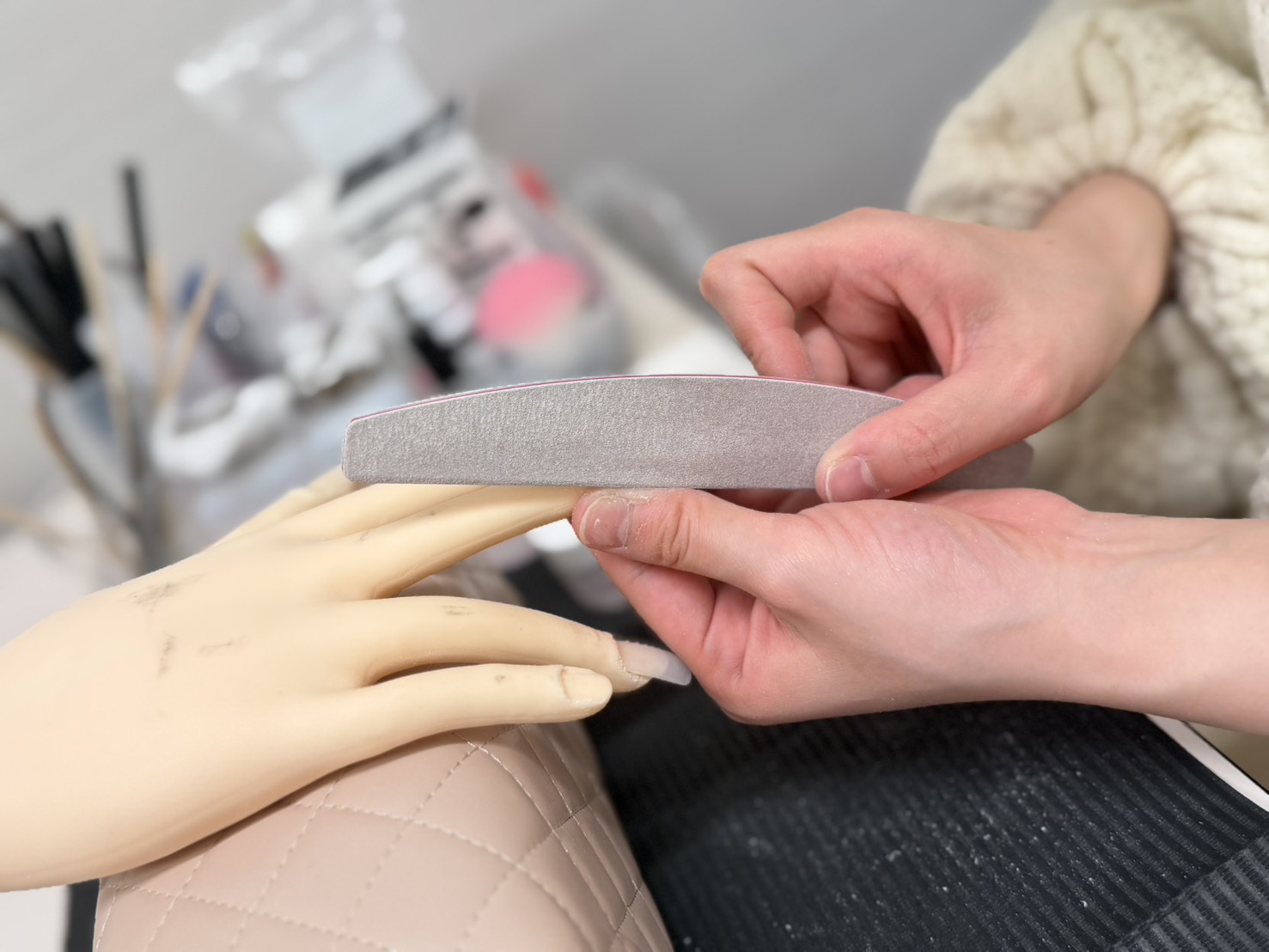 1級受験を控えた生徒様のレッスンでした。 今回はサイドストレートの中心部分がわずかに膨らんで見える点に着目し、ファイルの当て方や角度を細かく見直しました。 形を整える際は、ほんの少しの傾きや力のかかり方がラインの美しさを … 続きを読む 上達の証です